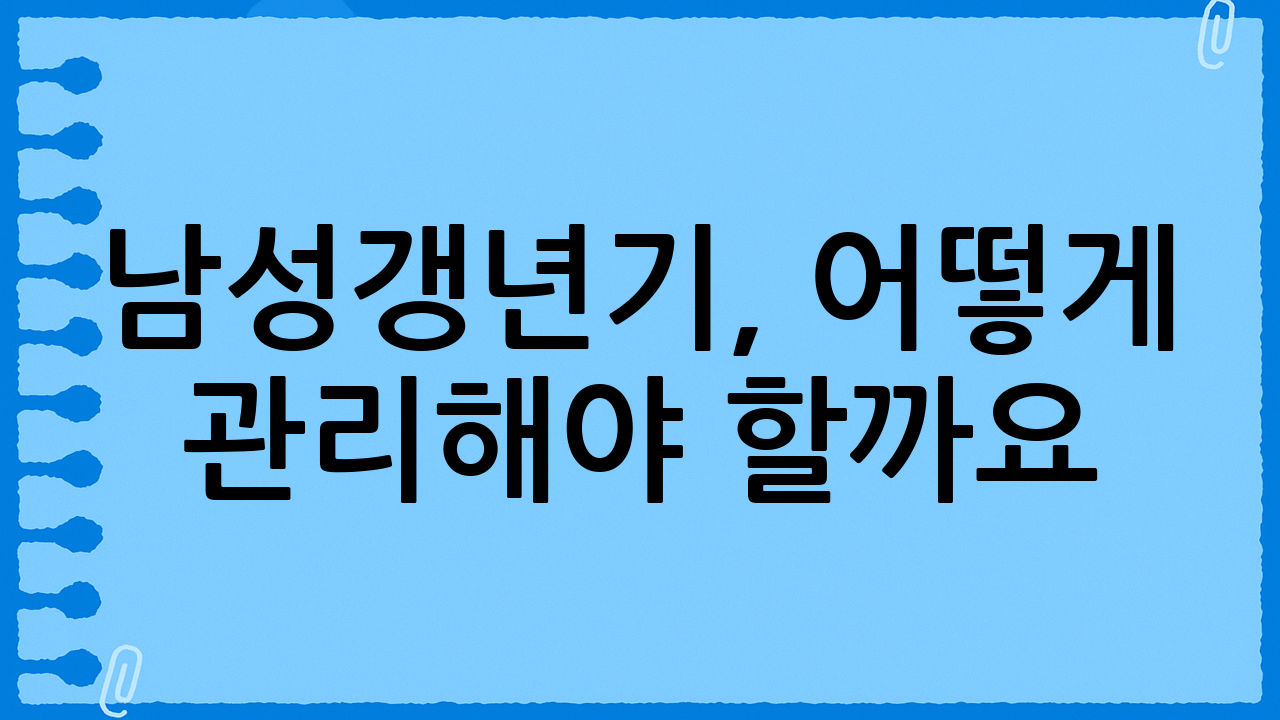 남성갱년기는 적절한 관리와 치료를 통해 증상을 완화하고 삶의 질을 향상시킬 수 있습니다. 남성갱년기 관리 방법은 크게 생활 습관 개선과 호르몬 치료로 나눌 수 있습니다.