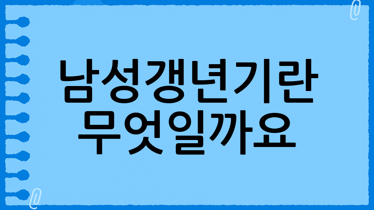 남성갱년기는 남성 호르몬인 테스토스테론의 수치가 점진적으로 감소하면서 나타나는 현상입니다. 일반적으로 40대 후반에서 50대 초반에 시작될 수 있으며, 개인차가 큽니다. 테스토스테론은 남성의 성 기능뿐만 아니라 근육량, 골밀도, 에너지 수준, 인지 기능 등 다양한 신체 기능에 중요한 역할을 합니다. 따라서 테스토스테론 수치 감소는 다양한 증상을 유발할 수 있습니다.