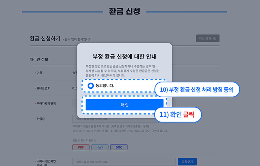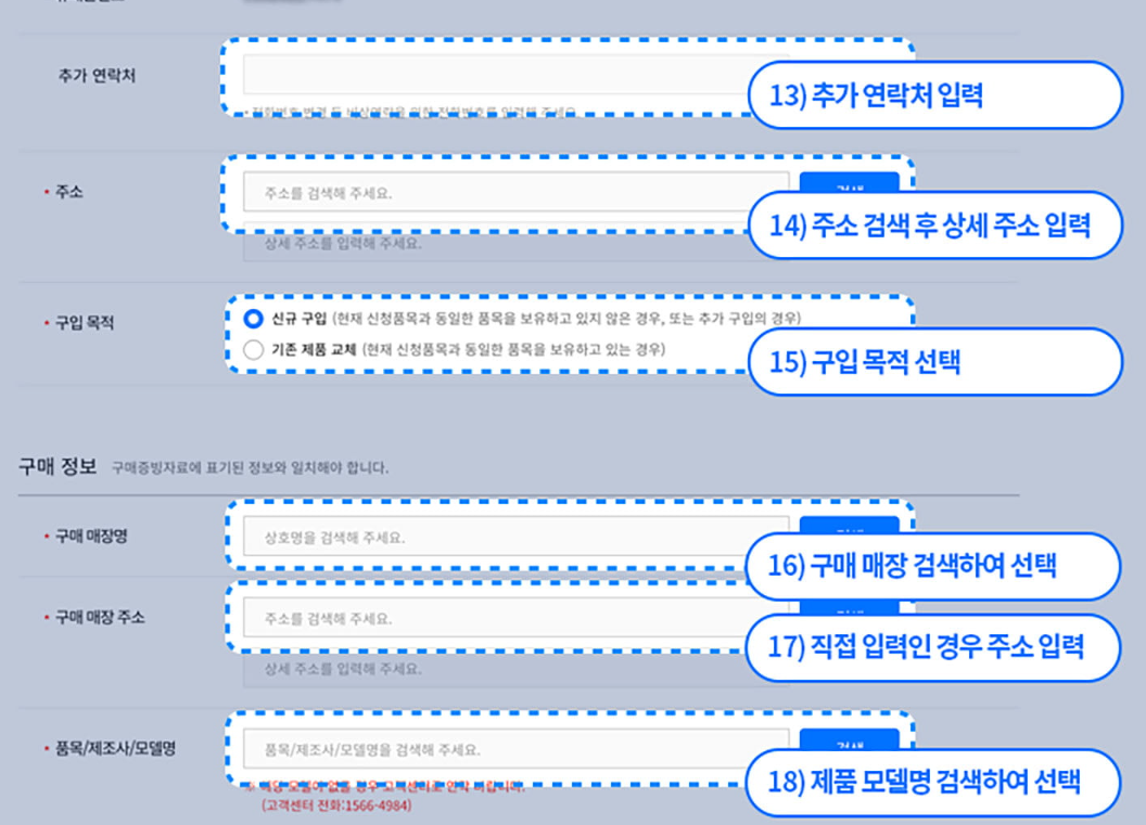 - 필수 기재 항목: 구매자 성명, 품목, 모델명, 상호·사업자번호, 구매금액, 구매일자, 승인번호