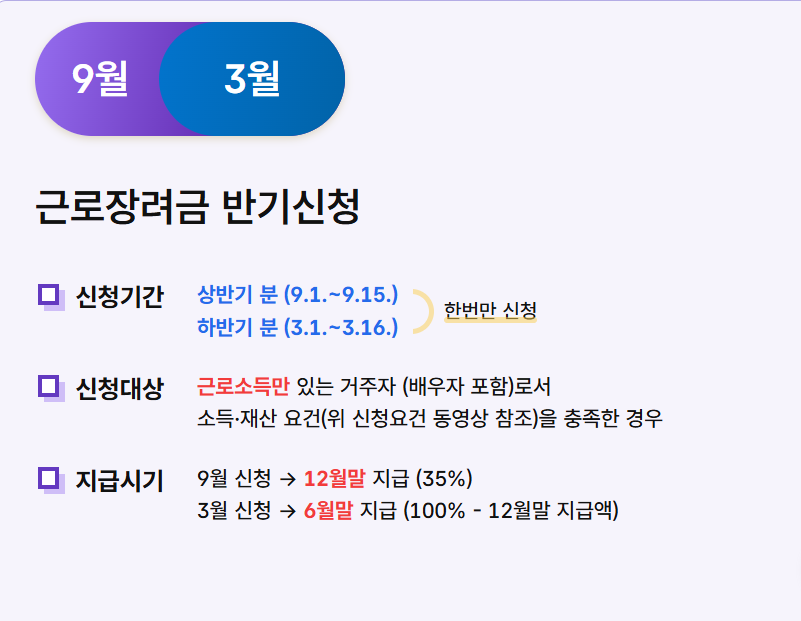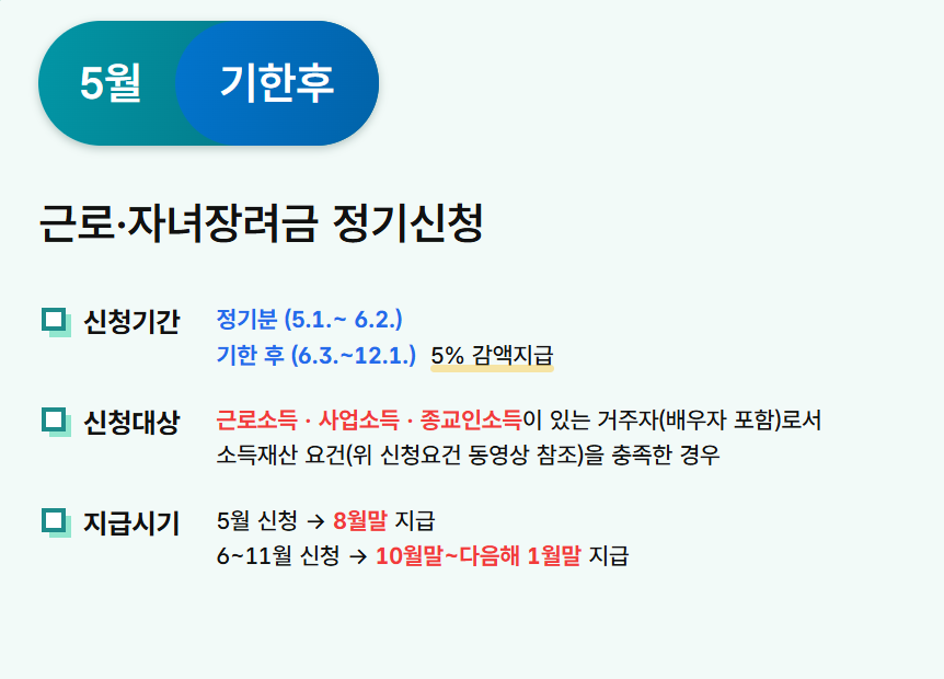 - 2025 근로장려금 정기 신청분 지급일: 8월 말~9월 초